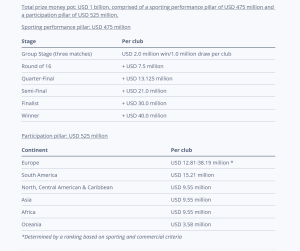 Од наградниот фонд 525.000.000 долари ќе бидат распределени само за учество на 32-та клуба, додека преостанатите 475.000.000 долари ќе се делат во зависност од постигнатите резултати на секој клуб посебно.